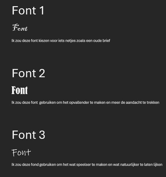Opzoek naar 3 verschillende fonts en bedenk waar jij deze voor zou inzetten